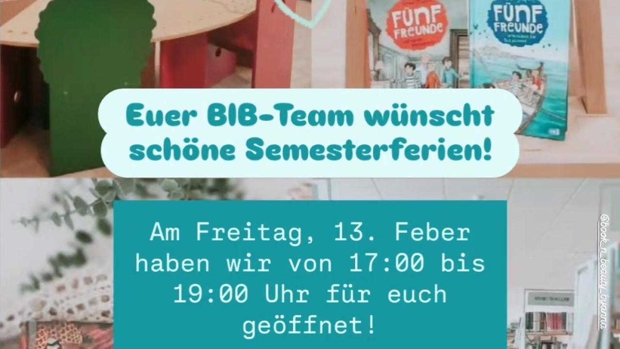 Februar, 2026 Semsterferien Wir wünschen euch erholsame Ferien!In den Ferien haben wir am Freitag (13.02.) für euch von 17:00 bis 19:00 Uhr geöffnet.Euer Bib-Team